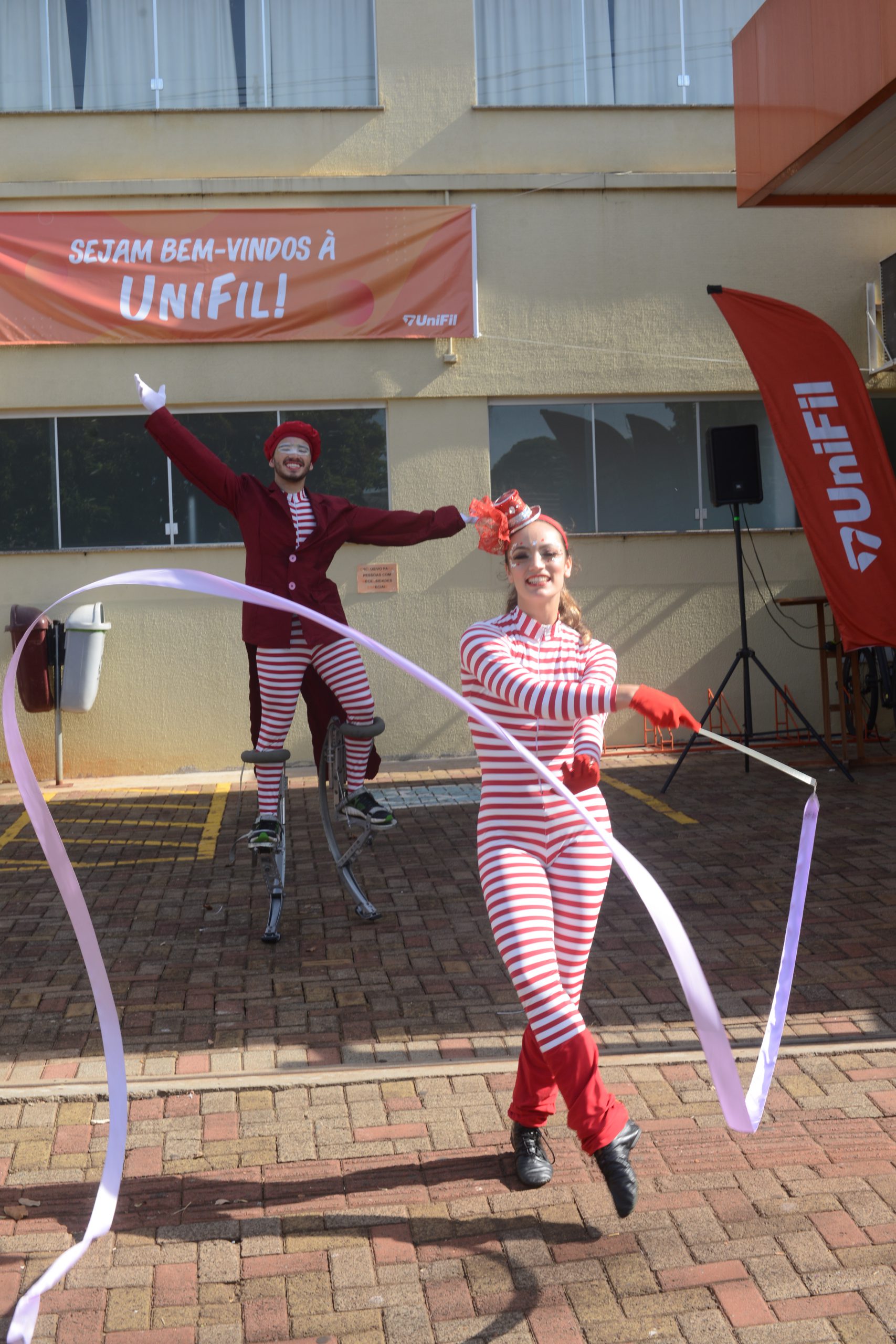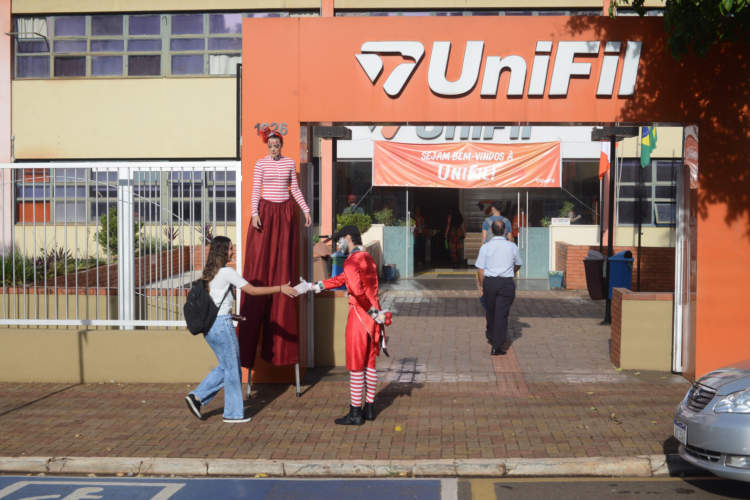 Para alegrar e descontrair o primeiro dia de aula, artistas da Escola de Circo Zirkus fizeram brincadeiras, deram boas vindas e interagiram com alunos nas entradas do Campus Sede/JK, Campus Canadá e Campus Ipolon – locais que concentram a maioria das turmas de primeiro ano dos cursos. Entre sorrisos e cumprimentos, o clima na segunda-feira de manhã foi de animação entre calouros e veteranos.